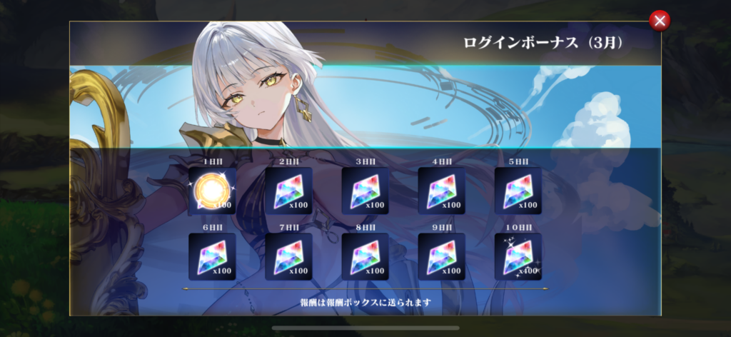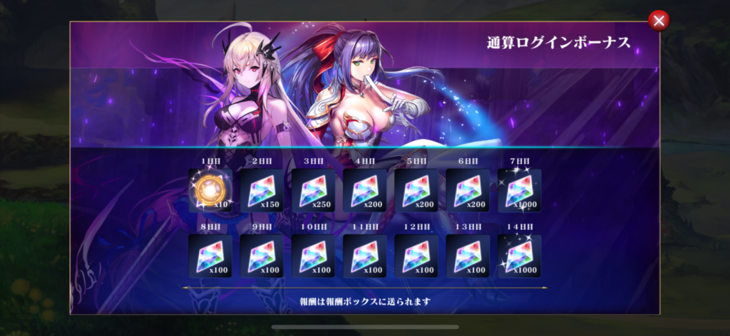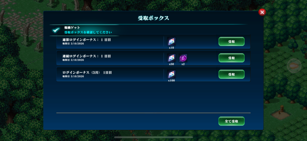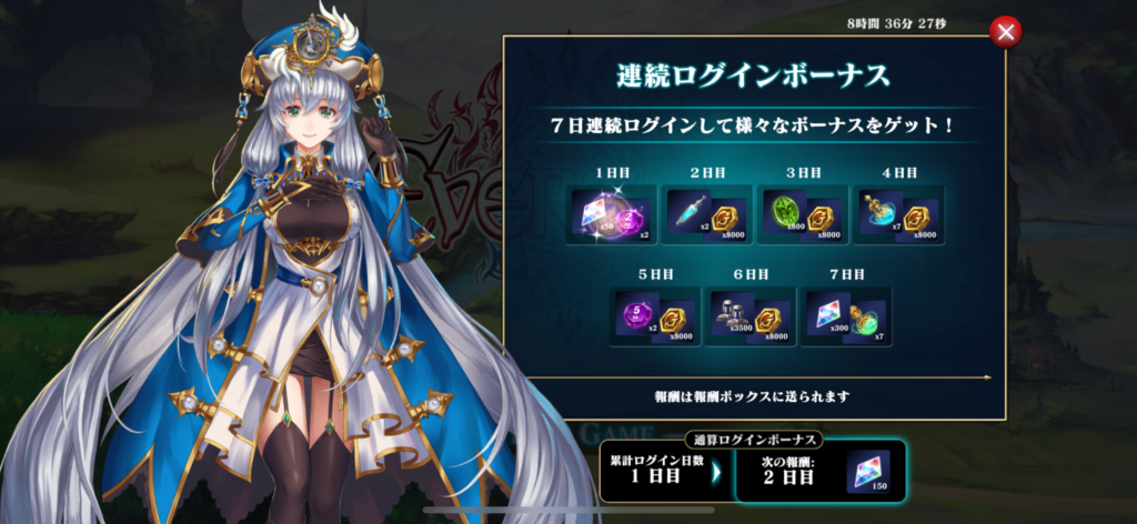 一度、ゲームを再起動するとログインボーナス画面になります。