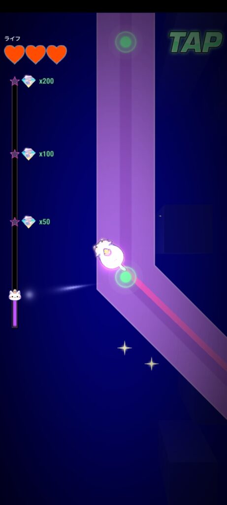 ネコが走るので、緑の丸の位置でタップして進むゲームです。
